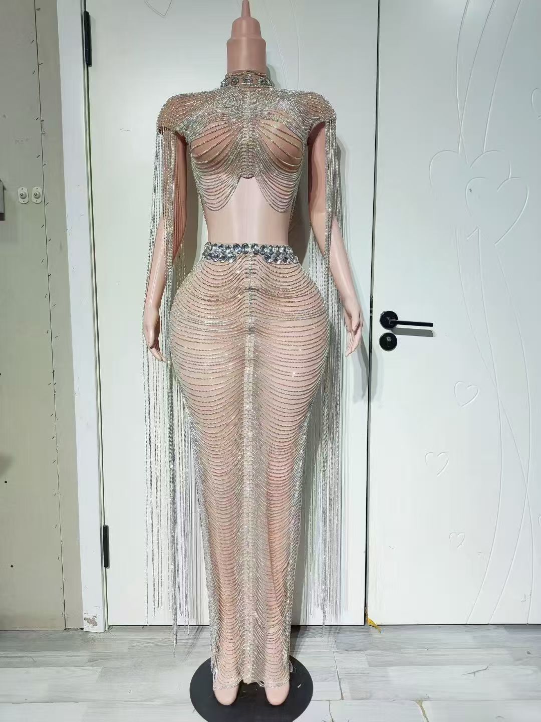 AD2620 Luxury Diamond Crystal 2-Piece Set Sexy Tops Shoulder Tassels Long Skirt Party Evening Summer Sets Women