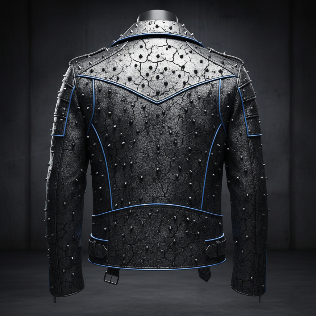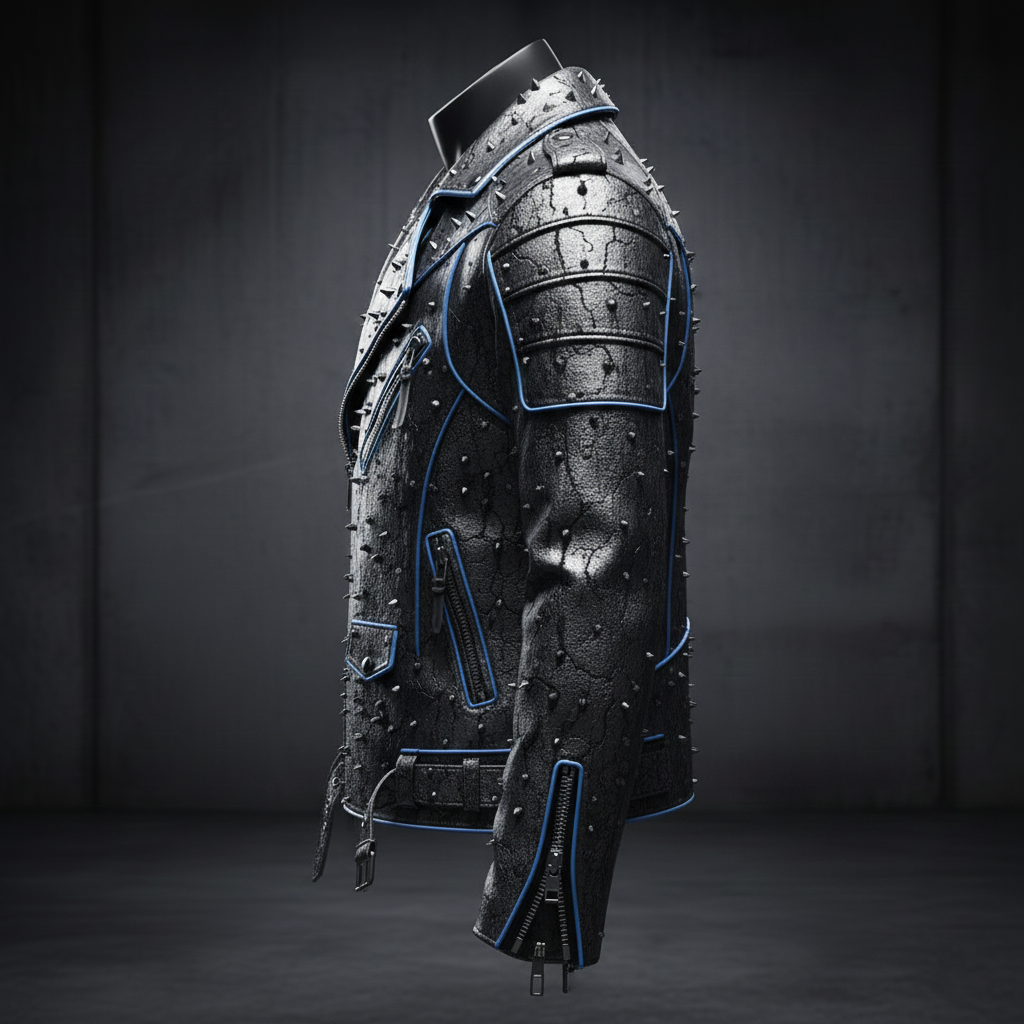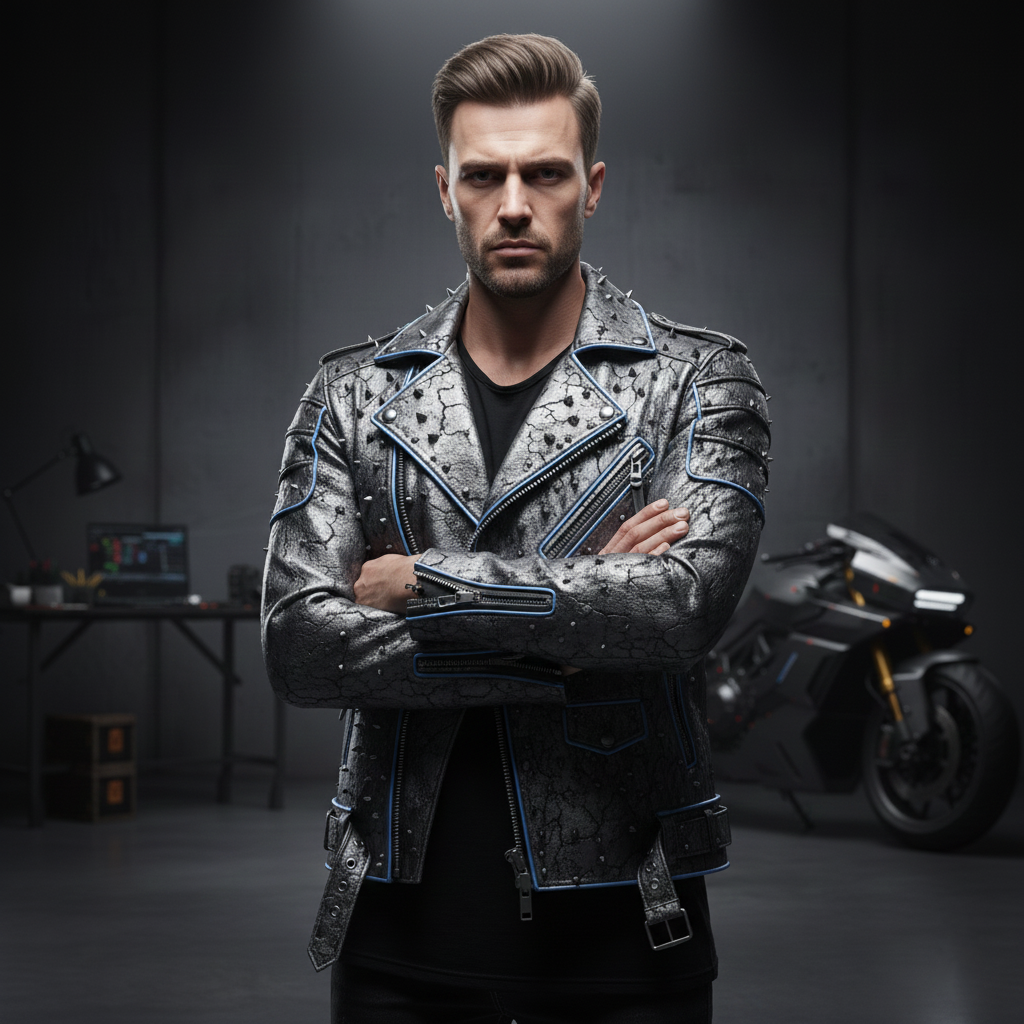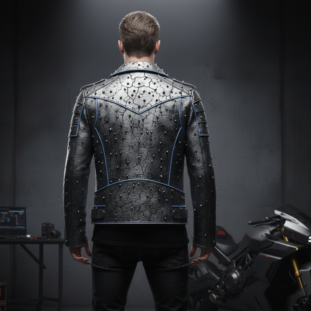 Aggressive Gunmetal Metallic Leather Biker Jacket with Futuristic-Punk Texture and Heavy-Duty Distressing