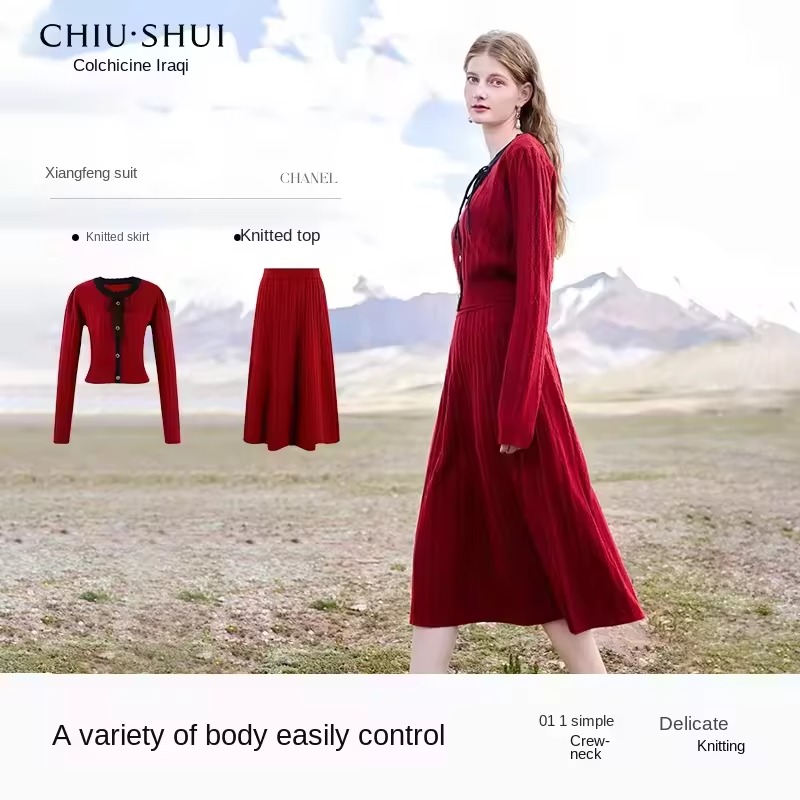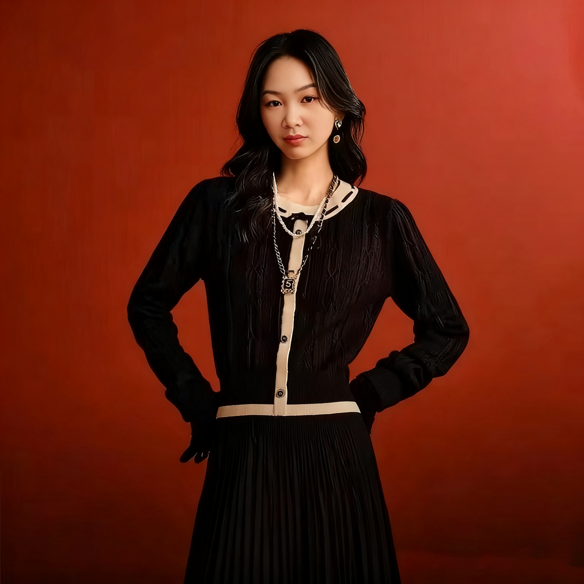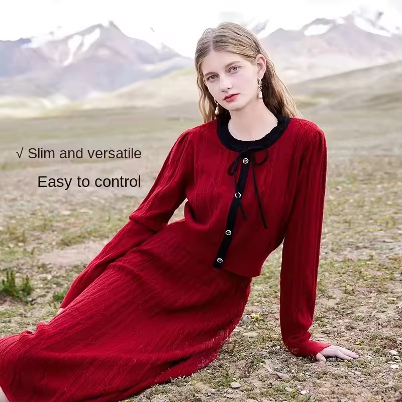 Fall Casual Basics 2 Piece Set for Women O-Neck Puff Sleeve Top High Waist Slim Corduroy Pleating Skirts