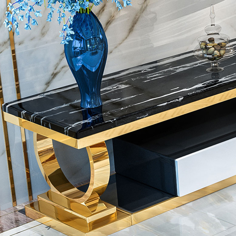 Modern Villa Gold Luxury Living Room TV Stand Furniture Rectangular Metal Home Storage Drawer Marble Top Long TV Cabinet