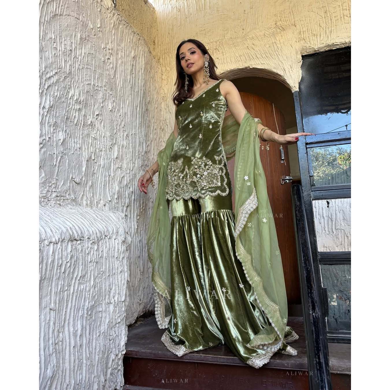 Women's Beautiful Sharara Suit and Dupatta with Moti Handwork for Parties
