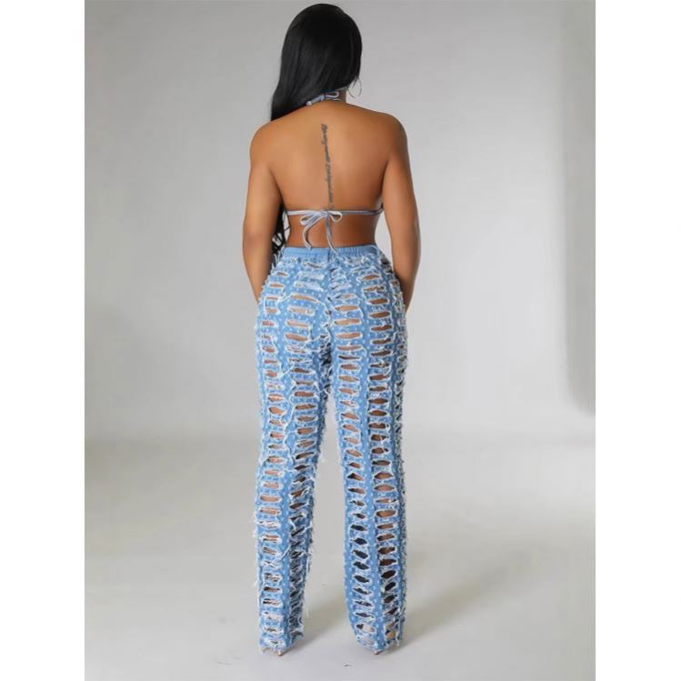 Customized Women's Fitted Suit with Stylish Striped Design, Acid-Washed Denim Pants